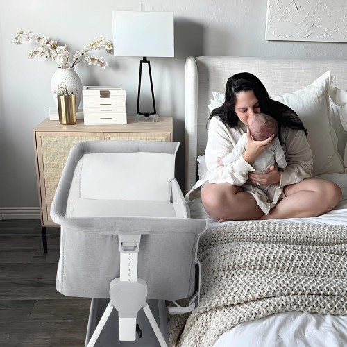 Cowiewie Bassinet Bedside Sleeper, Baby Bassinet with 7 Adjustable Height, Bedside Bassinet for Baby with Storage, Breathable Mesh & Mattress, Portable Bassinet Easy Folding (Grey and White)