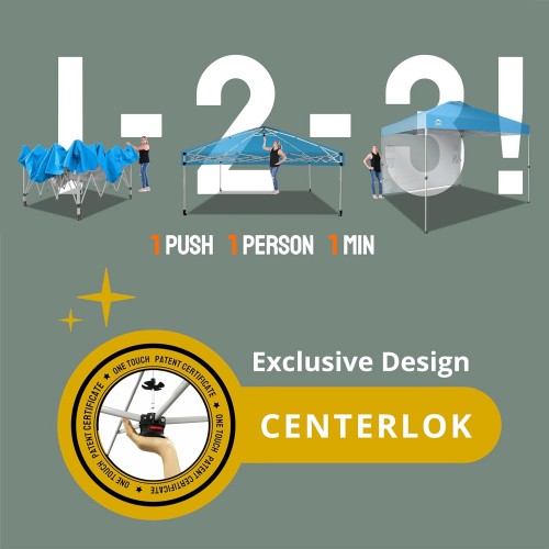 - ONE BUTTON EASY SET UP – Our 10×10 pop up canopy tent features patented one push center lock tech. With just a single push, the central hub locks the poles in place. Designed for the next generation, this outdoor canopy for patio can be set up by two people in seconds without any tools. Three adjustable height settings with soft, pinch-free buttons ensure convenience and safety, making it perfect for camping, beach outings, craft fairs, tailgating, farmer markets, outdoor BBQs, and more
