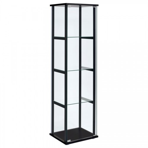 A modern version of a true classic makes a fabulous addition to a transitional space. With linear styling and a fresh look, this curio cabinet offers a perfect venue for showcasing treasured decor. Bold black tops a simple frame, top, and base. Tempered glass shelves create transparent space for display. Access its interior easily with push-to-open doors.