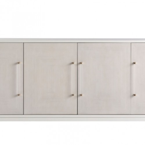 Practical yet graceful, the Desert Rose Sideboard features four doors in an Alabaster finish with acrylic and soft gold bar hardware, one tray drawer and adjustable wooden shelving within a sleek white lacquer case.