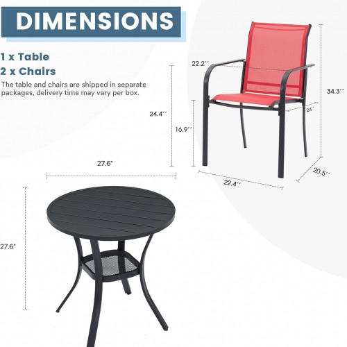 DIFY Outdoor Patio Bistro Dining Set for 2, Black Small Round Dining Table & 2 Red Stackable Metal Chairs with Breathable Fabric, Outdoor Furniture Set for Balcony, Porch, and Deck
