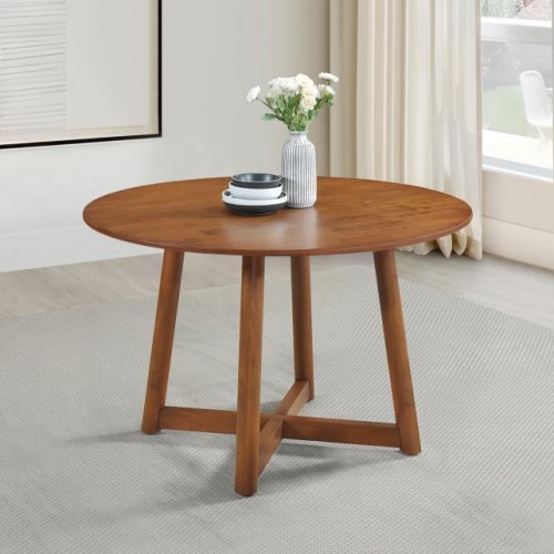 Create a pleasing casual setup in your easy-living space, making room for a small party or solo relaxation. This beautifully designed round dining table begins with construction of walnut finish rubberwoods, warm and inspiring of a coastal or Euro look. A convex tabletop profile embellishes the already fresh style of a seating venue with a versatile motif. Angled open sections interlock at the base to create a symmetrical and quirky design with extra verve. Your choice of this table reflects a discerning taste with long-term vision and a thirst for beauty along with casual aesthetics.