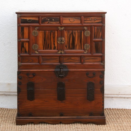 A masterpiece of natural artistry, this antique Korean chest (Ichung-Jang) celebrates the wood itself rather than ornate carving. The front panels are crafted from rare Persimmon wood, selected for its dramatic, dark-grained swirls that mimic mountains and flowing water. Framed in a darker, solid hardwood, the chest is accented with traditional brass hardware, including butterfly or round hinges and fish-shaped locks. Structurally, it features a row of four small drawers at the top for accessories, a central cabinet with double doors, and a large lower storage compartment originally used for storing bedding.