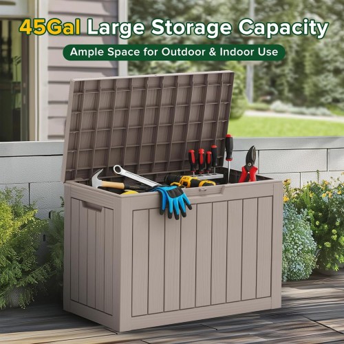 - Spacious & Sturdy Storage:This 45-gallon deck box supports up to 300 pounds. Its robust construction allows it to double as a sturdy patio bench or a reliable outdoor side table, offering both storage and functional versatility. Easily store items such as outdoor cushions and gardening tools to maintain a tidy and organized space.