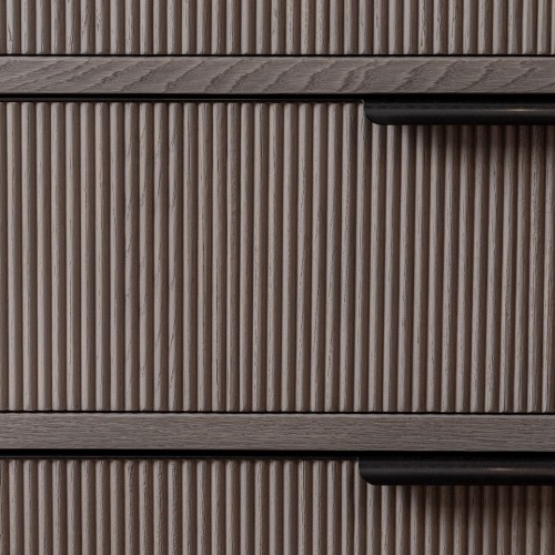 A subtle inlaid fluting detail covers the fronts of our six-drawer Enzo Dresser. Muted oak veneer is contrasted with sleek, blackened bronze edge drawer pulls.