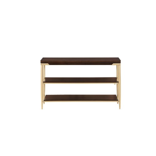 - KD, Rectangular Leg Sofa Table Storage: 2 Open Compartments (2 Wooden Shelves) CONSTRUCTION Wooden Top & Shelves: Wood Veneer, Pine Wood Metal Tapered Leg & Trim: Gold finish NO Drawers