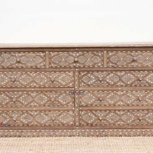 Introduce a touch of timeless elegance and intricate artistry to your bedroom with our Finely Inlay 9-drawer Long Dresser. Measuring a generous 72 inches wide, 18 inches deep, and 35 inches high, this substantial piece offers ample storage while serving as a stunning focal point. The dresser is meticulously handcrafted, featuring a breathtaking inlay design. Delicate materials are carefully hand-placed into a rich wood base, creating a mesmerizing floral pattern that adorns the drawer fronts and the dresser’s frame. The intricate detailing showcases the skill and artistry of traditional inlay techniques, often favored in royal styles for their opulent and detailed aesthetic. These designs, historically seen in palaces and grand estates, bring a sense of heritage and refined beauty to any space. The meticulous placement of the inlay creates a visual tapestry that exudes both sophistication and bohemian charm. The multiple drawers provide generous storage space for clothing and linens, making it as functional as it is beautiful. The neutral tones of the inlay against the wood create a versatile palette that can complement any room. This exquisite inlay dresser effortlessly enhances a range of design styles. It adds a touch of exotic elegance to global-inspired spaces, brings intricate detail to eclectic interiors, and offers a sophisticated statement in transitional and even some contemporary settings.