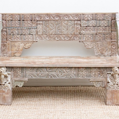 Prepare to be captivated by the exceptional artistry of this beautifully carved 60-inch bench. Every surface of this piece showcases intricate hand-carved details, a testament to the skill and dedication of the artisan who created it. From the elaborate backrest featuring floral patterns, geometric designs, to the intricately carved seat supports and armrests, this bench is a true work of art. The aged wood adds depth and character, enhancing the visual richness of this bench.