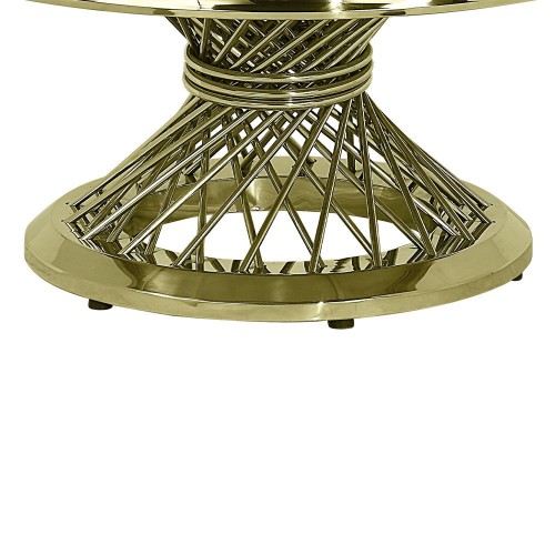 Explore the design power of mixed motifs in a round coffee table that promises to lift the ambiance in a modern space. This coffee table is constructed of lush gold finish stainless steel in a ring apron and twisted open rod cinched pedestal. Gold stainless steel configures an unusually shaped base with well-placed diminutive feet to protect flooring. Attention turns to an accessible, artificial marble top with a brilliant white finish, perfect for adding bright beauty to a living room or family room.