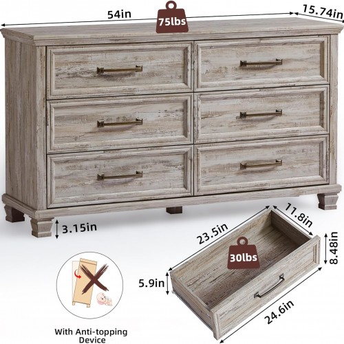 - [Charming Farmhouse Aesthetic] This exquisite 6-drawer dresser showcases a captivating farmhouse style, bringing a touch of rustic elegance and warmth to your living space. Its retro design seamlessly blends with various decor themes, making it a versatile addition to any bedroom, living room and hallway. Size:15.74″D x 54″W x 32″H.