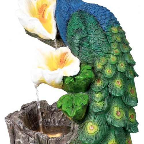 - Modern Design: The waterfall floor fountain Made of poly resin, this dazzling blue peacock with lovely detailed tail feathers provides a stunning water feature for your backyard escape. Create a relaxing oasis with this outdoor fountain, where water flows gently down the petals.