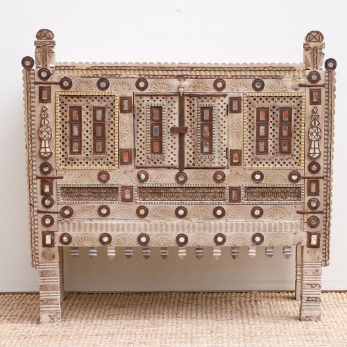 Envision a cabinet born from the heart of India, a piece that once graced a grand home, perhaps a haveli or a royal chamber, its intricate details whispering tales of a rich and vibrant past. This style of cabinet is known in India as a ‘Damachiya,’ traditionally a dowry chest, a repository of a bride’s personal belongings, treasures, and hopes for the future. This Damachiya is a captivating symphony of form and artistry. The elaborately carved panels, with their mesmerizing geometric and stylized floral designs, are a testament to the enduring tradition of Indian woodcarving, where artisans poured their skill and soul into every line and curve. These carvings, often featuring intricate patterns and motifs, speak of a time when craftsmanship was revered and beauty was woven into everyday life.
