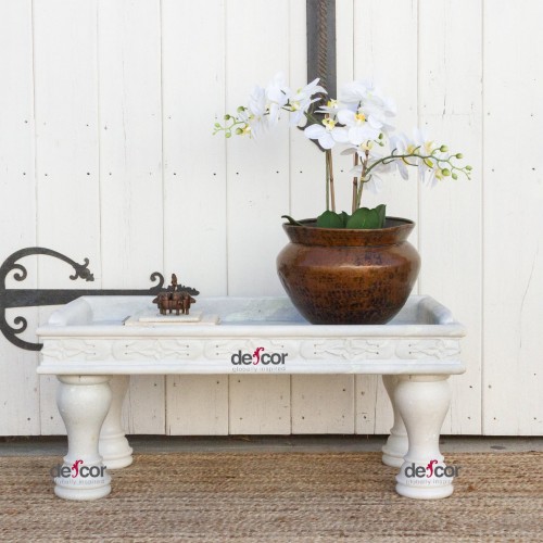 Originally found in Northwest India, this elegant trough design has been recreated into a charming coffee table. This exceptional handcarved coffee table is made from a thick shaped slab as the top stands on robust rounded legs. This traditional Indian coffee table is handcarved from single slabs of marble. This marble table has a pure white wax polish. This table is heavy and has legs that come apart for transportation.