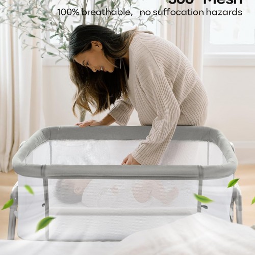 Fodoss Bedside Bassinet for Baby with Wheels, All Mesh Bedside Crib with Storage Basket, Hight Adjustable and Easy Assembly