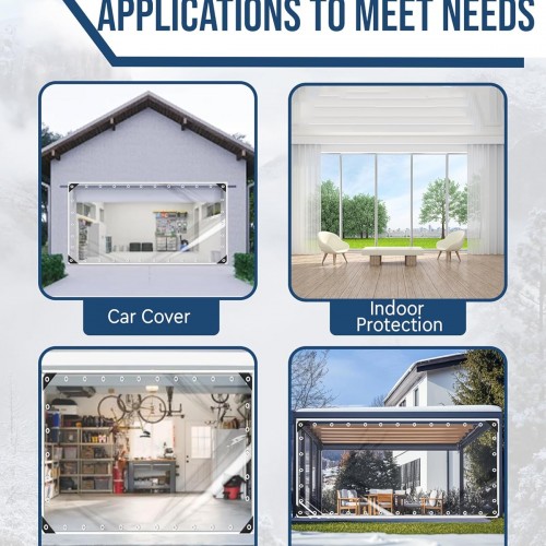 - PREMIUM PVC MATERIAL: CORE OF DURABILITY:High-quality PVC construction offers waterproof, tear-resistant performance. 14 mil/0.35mm thick with 100% light transmission. 14 sizes (3′×6′ to 12′×16′) fit gazebo curtains, chicken coops; 7′×8′/8′×10′/8′×15′/10′×16′ ideal for residential gazebos’ winter wind/rain protection.