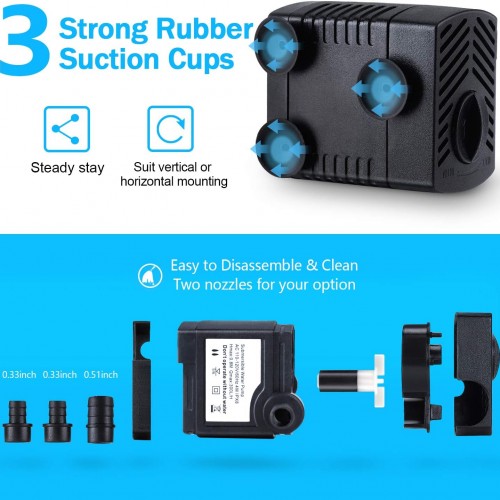 - COMPACT BUT POWERFUL–The fountain pump’s compact design is easy to hide & disguise, 4W super efficiency motor continually lift water column. reasonable long power cord is heavy duty and easy to installation. The pump has 3 strong rubber suction cups at the bottom of the fountain pump help keep in your fish tank.