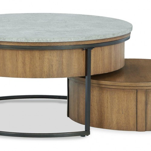 Beautiful to behold, this occasional table package occasional table package is loaded with style. Featuring an urban contemporary profile, it features a coffee table with suspended drum design and a durable faux cement melamine lift top with hidden storage. Equipped with casters for easy access, the rolling trunk does double duty as serving space and storage. The end table with its open cubby is perfect for stowing away books and magazines and a cleverly placed AC/USB charging port on top lets you power up without moving a muscle. Perfect for mixed-use living arrangements.