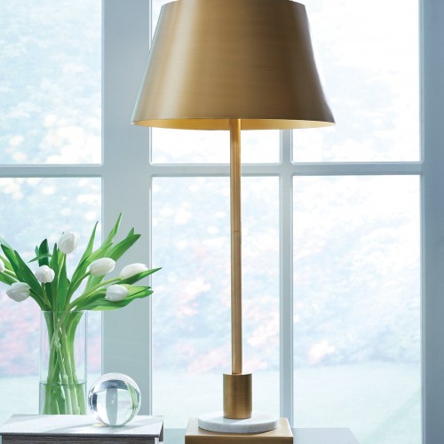 Sleek and glamourous, this contemporary table lamp shines the spotlight on modern luxury. Its rich goldtone finish, elongated body and white marble accent are utterly elegant. A luxe addition to an office desk or bedside table, it’s topped with a gleaming goldtone shade to complete the look.