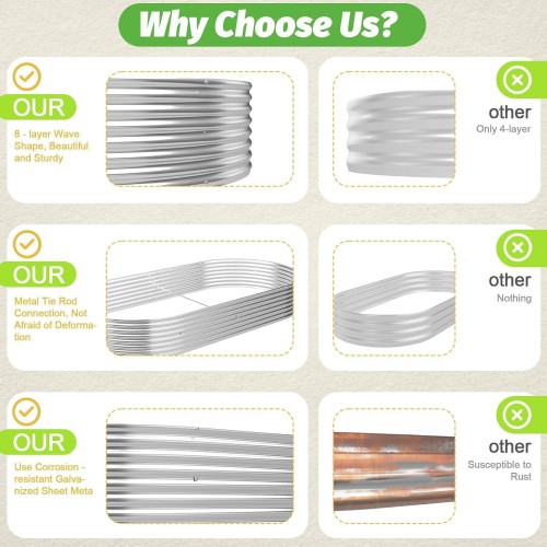 - Durable material: This raised bed is made of galvanized steel with a wavy structure that is stable and can withstand daily wear and tear. Long service life, can be exposed to sunlight, rain and snow for a long time, suitable for various climatic conditions.