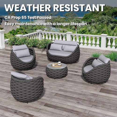 - Furniture set is crafted from reinforced rust-free aluminum alloy frame, wrapped in hand woven textilene rope. The 5 pieces all weather patio upholstered conversation set resists to UV, rain, wind, salt water. Perfect for indoor outdoor even arid or coastal areas