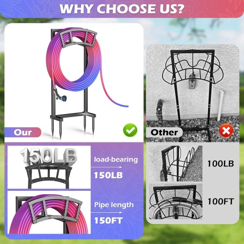 Garden Hose Holder Freestanding, Outdoor Heavy Duty Water Hose Holder Reel with 4 Spikes Holds 150-ft Water Pipe, Detachable Metal Hose Storage Stand Hanger Rack for Outside Yard Lawn Farm, Black