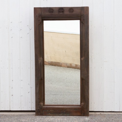 Picturesque 19th century Malabar mirror frame. It features lovely carved motifs of a cross and flowers on top and on the sides. The frame has a rustic appeal, the wooden frame being made from a very chunky and solid wood. These types of frames where found in old mansions in Goa.