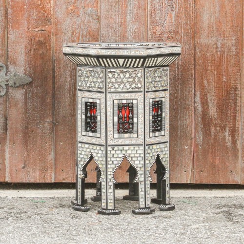Masterfully constructed, this exotic side table boasts splendid marquetry inlaid work using mother of pearl. The octagonal top lifts up for storage and the whole piece stands on arched legs.