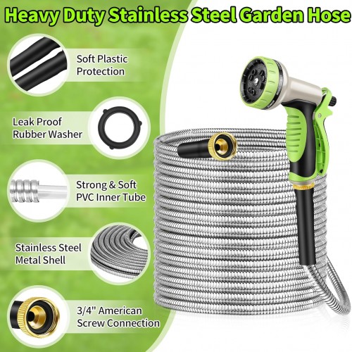 GOXAWEE Garden Hose 100FT, Stainless Steel Heavy Duty Water Hose With 10 Function Nozzle, No-Kink, Tough & Flexible, Sturdy and Lightweight, Rust Proof for Yard, Outdoor, RV