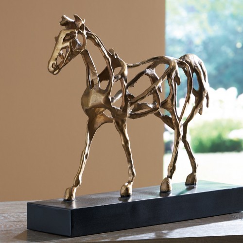 This magnificent equestrian sculpture is a stunning yet casual statement piece in step with your laid-back lifestyle. A cast iron figure in an antiqued goldtone stands atop a contrasting black metal base, making this sculpture a striking conversation starter on any shelf or tabletop.