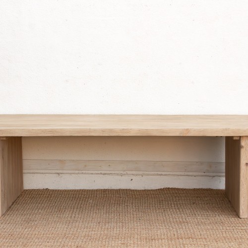A custom distressed bleached wax finish gives the wood a soft, matte patina. It removes the “orange” tones often found in reclaimed wood, resulting in a sophisticated, sun-washed neutral that fits effortlessly into California Modern or Belgian Farmhouse interiors.