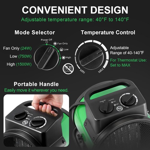 - 【Portable Greenhouse Heater for Multiple Uses】Functions as a outdoor heater, plant heater, patio heater, camping heater, greenhouse heater, tent heater, or garage heater with thermostat, delivering fast heating with 750W/1500W modes and fan only circulation. A versatile choice for both indoor and outdoor winter needs