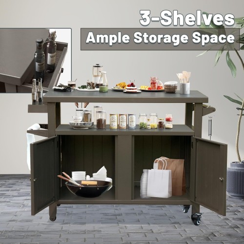 - Versatile design – two sides of grill cart can place paper towel,hook holder, condiments, drinks or barbecue tools, allowing you take them easily during the barbecue. On below of the outdoor grill cart with a cabinet to store your kitchen tools,food,or snacks. Outdoor grill carts with 4 wheels for effortless movement. You can lock the cabinet doors to prevent pests