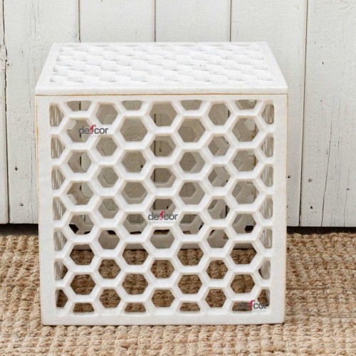 Modern meets Mughal with this captivating marble side table. Handcrafted from pristine marble, this piece draws inspiration from the intricate Jali window designs of 16th-century palaces. The base and top features a mesmerizing beehive geometric pattern, meticulously carved for a touch of timeless elegance.