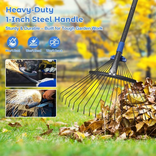 - Heavy-Duty 1″ Steel Handle-Anti-Rust & Reinforced for Longevity Engineered with a 1-inch thick steel shaft and finished with premium black anti-corrosion coating, this heavy duty metal rake stands up to moisture, pressure, and repeated use. Effortlessly clears thick piles of wet leaves, pine needles, and debris—an upgrade from typical lightweight garden rakes or lawn rakes.
