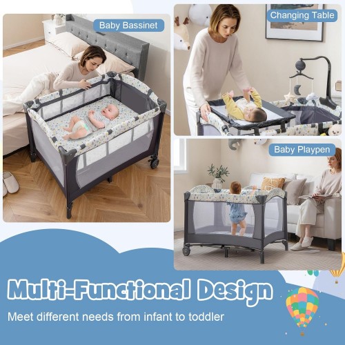 HONEY JOY Pack and Play, 4 in 1 Portable Baby Playard with Bassinet, Changing Table, Lockable Wheels, Music Box, Foldable Travel Baby Crib Nursery Center from Newborn to Toddler (Gray)