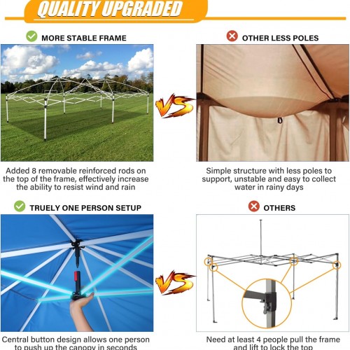 - ONE BUTTON EASY SET UP: Our 10×20 pop up canopy tent features patented one-push center lock system. With just a single push, the central hub locks the poles in place. Designed for the new generation, this outdoor canopy tent can be set up in a short time without any tools.