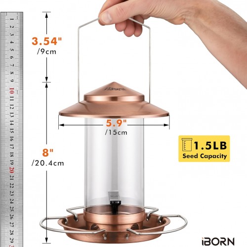 - 【Squirrel Chew-proof Metal Roof, Metal Tray, PC tube】Metal bird feeder are squirrel chew-proof. Avoid squirrels chew or broken by accidence,this iBorn wild bird feeders has Solid Chew-proof PC Tube, well built to with stand different weather. PC material is strong material of shield grade hardness will not crack even if squirrel bite it. Metal Roof & Tray hopper bird feeder, thicker metal make it heavy duty that not easy to swing by wind blow or birds actions.