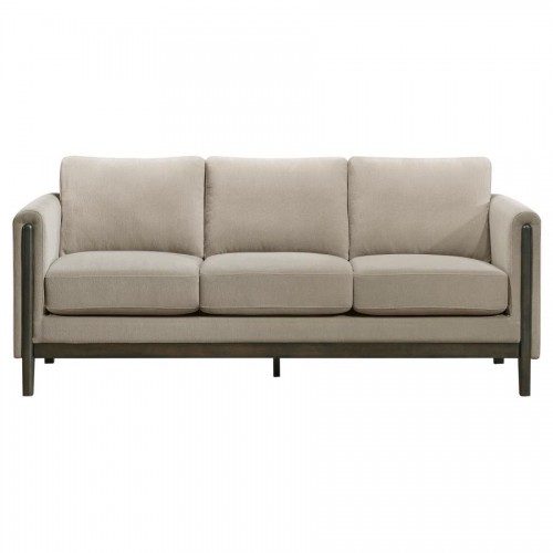 Rooted in clean lines and modern comfort, this upholstered sofa offers a grounded yet welcoming presence. Its engineered wood frame in a rich coffee finish defines the silhouette, while recessed panel arms add architectural interest. Upholstered in soft taupe polyester, the sofa features plush, reversible seat and back cushions for extended comfort and longevity. A refined blend of structure and softness for today’s living spaces.