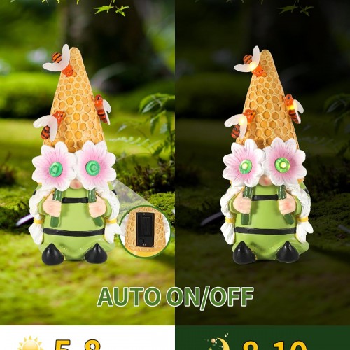 - 💡 LED Lighting: As dusk falls, watch the gnome’s flower eyes and bee come alive! The integrated LED lamp emits a soft glow, highlighting its intricate features.