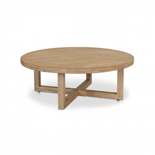 Crafted from solid oak, the Joel coffee table’s thick round top features a thoughtfully crafted V-groove, adding a visual lightness to the substantial surface. The geometric base, with crisscrossing stretchers, grounds the piece with quiet confidence. A natural, wire-brushed finish enhances the oak’s organic beauty, creating a focal point of understated elegance.