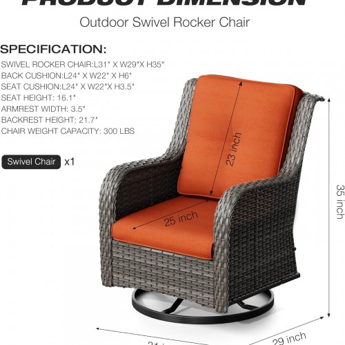 - Ergonomic Structure: This wicker swivel patio chairs have comfortable streamlined seats, ergonomically designed backrests and widened armrests which can provide the utmost comfort. The thick and soft back & seat cushions make you feel more comfortable to sit on and enjoy your patio leisure time
