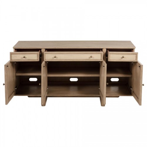 Bring both beauty and functionality to your dining or living space with this elegantly crafted sideboard. Featuring a warm, beige oak wood finish, this sideboard offers ample storage with three spacious drawers and three cabinet compartments behind four doors, perfect for organizing dinnerware, linens, or other essentials. The hand-woven cane door fronts add a touch of artisanal charm, while the adjustable interior shelves provide versatility for your storage needs. The rear cutouts allow for easy cable management, making it suitable for use as an entertainment center or buffet. Whether you’re looking to enhance your dining room, living area, or hallway, this sideboard delivers timeless style and practical functionality.