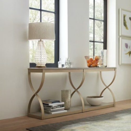 Gently sloped padded seat in a neutral linen blend performance fabric rests within a solid birch wood frame finished in light walnut, with a brushed nickel metal kick plate. Seat height is 26″.