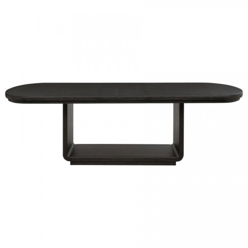 Rooted in quiet strength and sculptural beauty, this extension dining table brings graceful presence to every gathering. Its soft-edged rectangular top rests on a bold pedestal base, finished in burnished black for depth and contrast. When needed, a removable leaf extends the surface with the help of equalizing metal cable glides, allowing for smooth expansion. Whether hosting intimate dinners or festive occasions, this table adapts with effortless elegance.