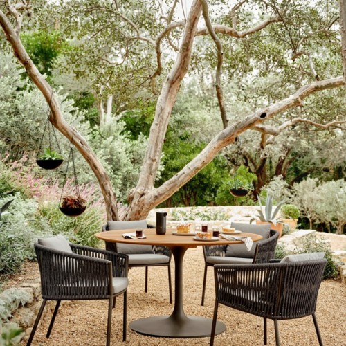 Trend-forward appeal, indoors or out. UV-resistant and water-repellant Sunproof fabric delivers stylish durability to outdoor-friendly teak and rope-based designs. Clean lines, X frames and palatable neutral tones boost the versatility of living and dining styles, with natural materials standing front and center.