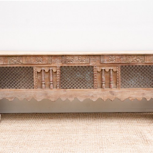 Considering the carving styles, the presence of jali work, and the overall scale, this piece likely dates to the late 19th century. It reflects a period of rich architectural heritage in India, potentially influenced by a blend of traditional Indian design with subtle colonial adaptations. The use of reclaimed elements in furniture design adds a layer of sustainable style, transforming a piece of India’s past into a functional and beautiful statement in a modern home.