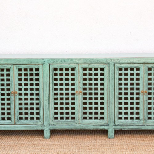 A magnificent Chinese lattice sideboard. Measuring a generous 86 inches long, 18 inches deep, and standing at a versatile 35 inches high, this cabinet offers both a substantial presence and exceptional functionality.