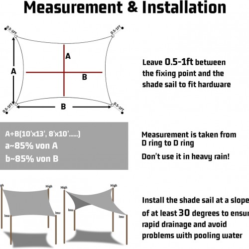 - 【Installation】Waterproof shade sails need to be installed at a 30-degree angle with maximum tension to allow run off and face up. Otherwise the water may accumulate and affect the use of the shade canopy