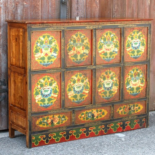 This antique Tibetan cabinet is as beautiful as it is practical as this piece is perfect for storage as its double door front opens to shelving. The front of the piece is heavily decorated with hand painted floral motifs, and the top and sides of still preserve elements of its original painted finish. It was made using dovetail joints so there are no screws present.