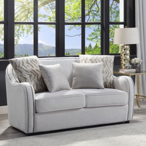 Create a clean, contemporary look with the gently curved Mahler living room set. The inner wooden frame and block plastic legs offer maximum support. Upholstered in a beige textured linen fabric and outlined with nailhead trim. The barrel seat and sloping armrests make for plush, modern depth that envelopes guests in comfort and style from all angles. The included accent pillows complement the set beautifully and provide added comfort while lounging.